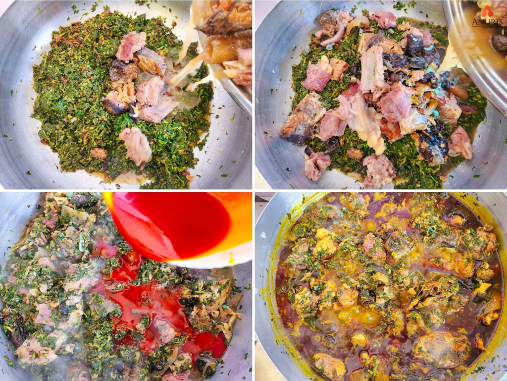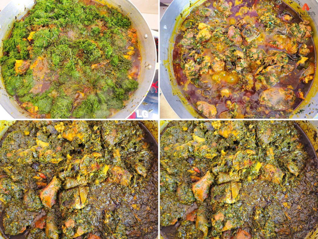 Afang soup consumes oil, so donโt be afraid to add enough. If you add too little oil, the soup will look green and flat instead of rich and glossy.