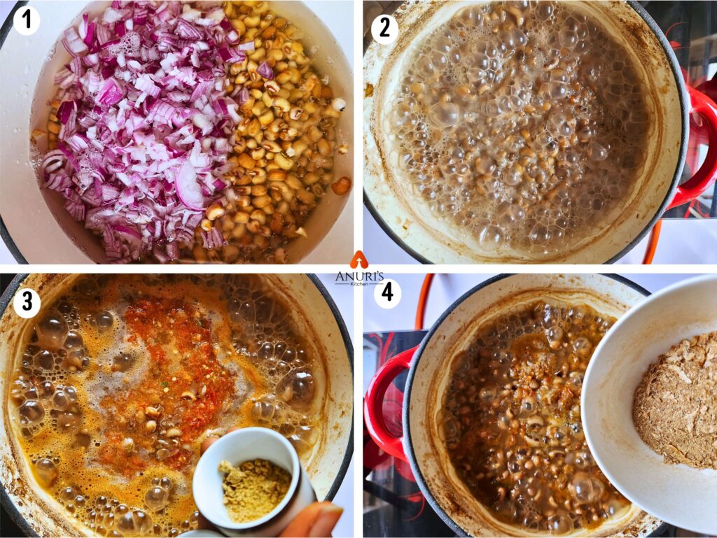 While the beans ais cooking with the onion, check at intervals to see if it has softened. You don’t want to cook hard rock beans. So, you allow it to soften and add water at intervals.